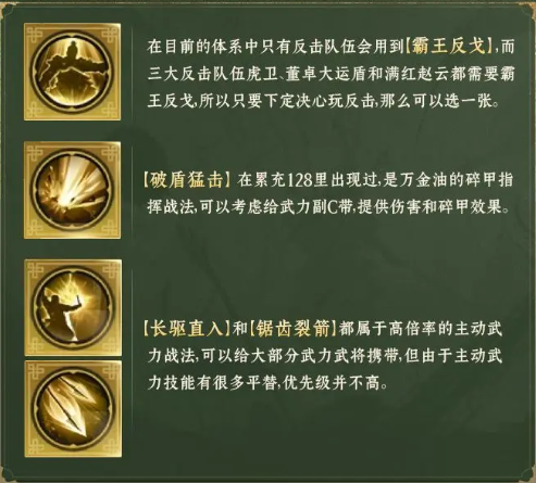 1、霸王反戈:反击队伍刚需,附带碎甲效果,适配赵云、典韦、许褚、董卓、孙策等武将。
