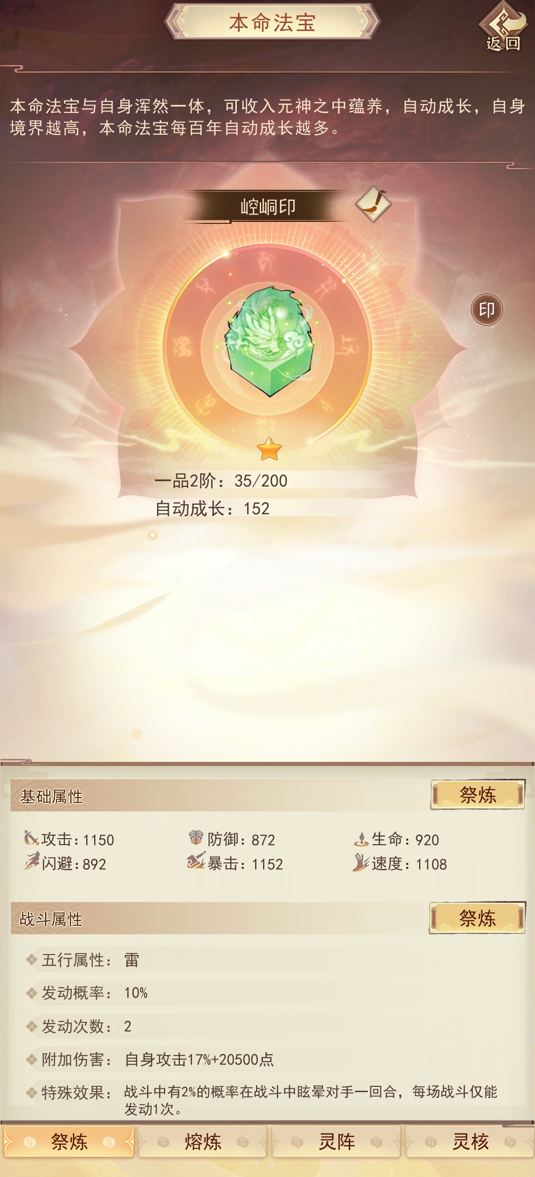 临近散仙即可开始熔炼本命法宝,熔炼进度满后即可出战本命法宝。
