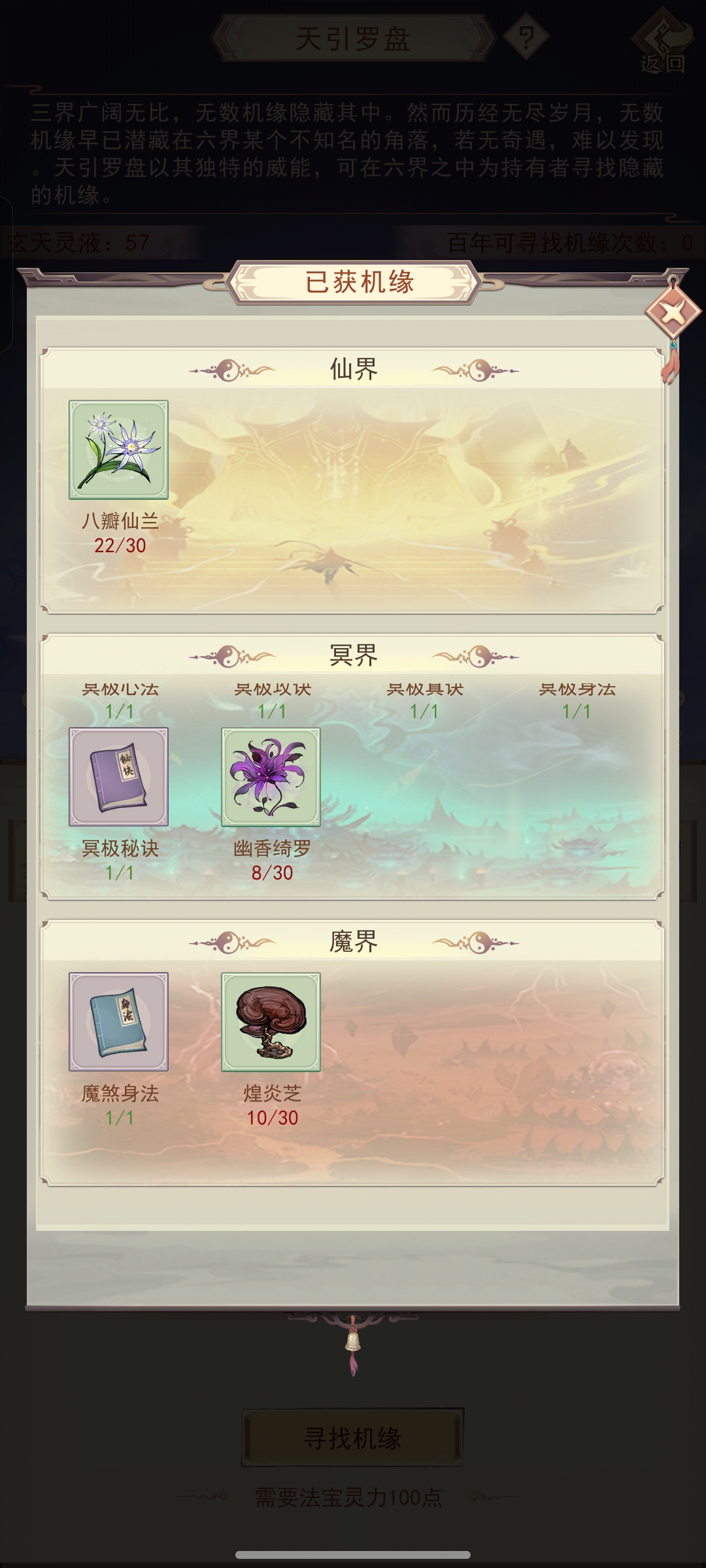 散仙可以兑换天引罗盘,每天随机获得功法、三维丹、天品法宝、草药、矿材等资源。