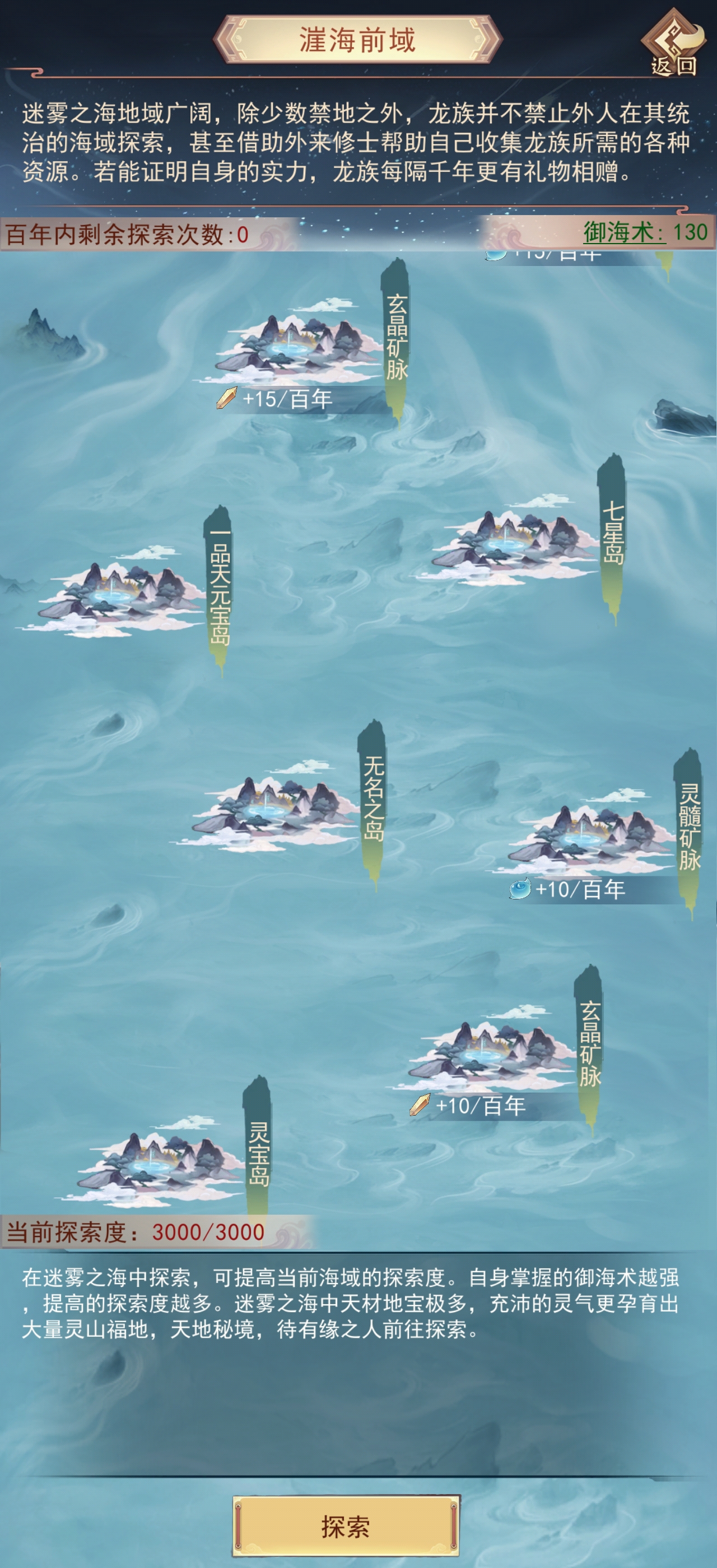 每次探索时可能给龙元草/龙珠,龙元草先兑换1本御海诀,升满再兑换下1本,以此类推。