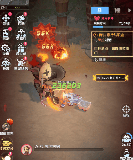 3、活动开启时,点击图中的红色光圈会自动前往,到达地点后击杀一定数量的小怪,则会自动前往第二阶段地点,继续击杀一定数量的小怪,两波小怪结束后,前往BOSS出现地。
