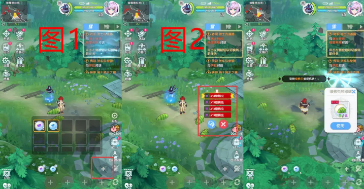 如下图1红框所示+号,点击后将宠物球放入快捷栏;
