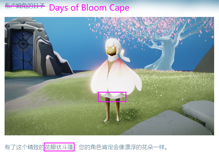 7.这个翻译真的离谱hhh 这个花瓣斗篷也是绝美了 粉白渐变+花蕊的图案真的好看绝了 我之前还担心它会像圣岛季的贝壳斗 现在看来完全是另一种美 呜呜呜真好看