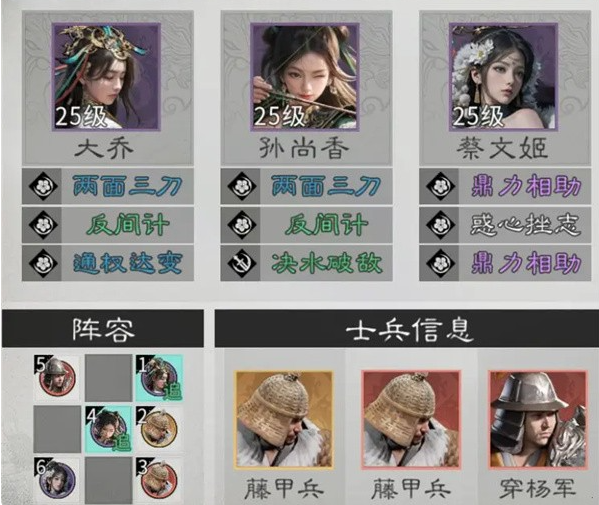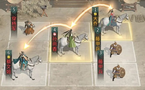 1、由于大乔与孙尚香互相占追击格,因此大乔只能放置在前排,同时在前排补充2个藤甲兵或陷阵营来承担伤害,后排则可补充一个穿杨军或连弩军以提升输出。