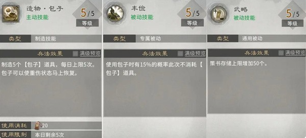 主动技能效果为包子制造,被动技能效果为减少包子消耗和提高策书上限,根据自己的包子消耗自行选择,包子多可以选择不点【丰俭】(使用包子有概率不消耗)。