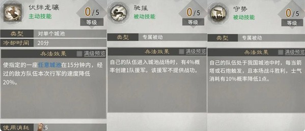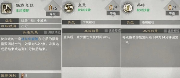 主动技能效果擂鼓需要消耗士气,效果较为一般可以选择不点满。被动技能【重整】,本服沙盘没有统一时推荐点满,统一后以跨服为主时点1级即可。被动技能【养晦】,策书恢复时间根据你的策书上限自己选择点数即可。