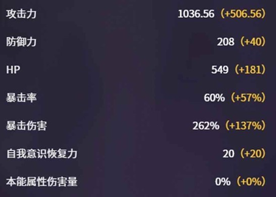 在输出维度上,她的暴击率可以达到60%,其中57%来自属性加成;暴击伤害则固定为262%。这样的属性组合确保了她在普攻和技能释放时都能拥有极高的暴击触发频率,完美契合核心C位的定位。此外,20点的自我意识加成能够显著提升机制类效果的生效频率,例如被动技能的触发和连携技的响应,从而增强操作的容错率和战斗节奏的稳定性。