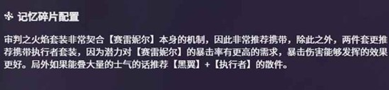 记忆碎片的选择是赛雷尼尔战力成型的关键。主选套装推荐「审判之火焰」,这套装的专属效果与暴击率、暴击伤害这两项核心增益深度绑定,能够直接放大赛雷尼尔的伤害乘区。副选的两件套装则优先考虑「执行者」,该套装提供的潜力类暴击率加成,可以进一步压缩暴击阈值,提升暴击的稳定性。当「审判之火焰」与「执行者」组合后,能够形成“高覆盖率与高倍率”并存的双驱动输出模型,有效规避单一属性堆叠可能遇到的瓶颈,让赛雷尼尔的输出更加平滑且高效。