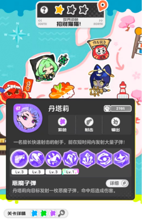 攻打招财猫猫,主要的核心思路便是远程输出为主,还要选择具有高频回血保障的角色组合,要详细了解boss的具体弱点,利用地图机制来急速通关,比较推荐的队伍就是紫色系角色丹塔莉,蓝色狄安娜以及绿色贝斯特。这套阵容拥有着较快的回血速度,比较适合大范围远程攻击,兼顾高频治疗和远程爆发,轻松应对招财猫猫此boss的攻击模式。由于地图当中有着极高的随机应变。