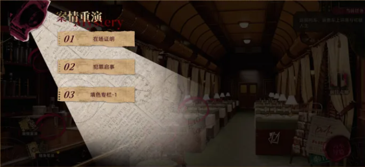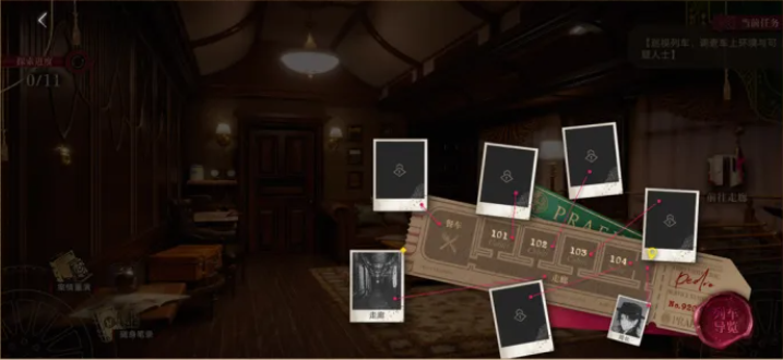 列车导览:在列车导览中,玩家们可以查看自身所处位置,还有列车地图信息,点击照片就能快速前往所属车厢;随身笔录:可查看当前已经获取的角色,还有证物相关信息。