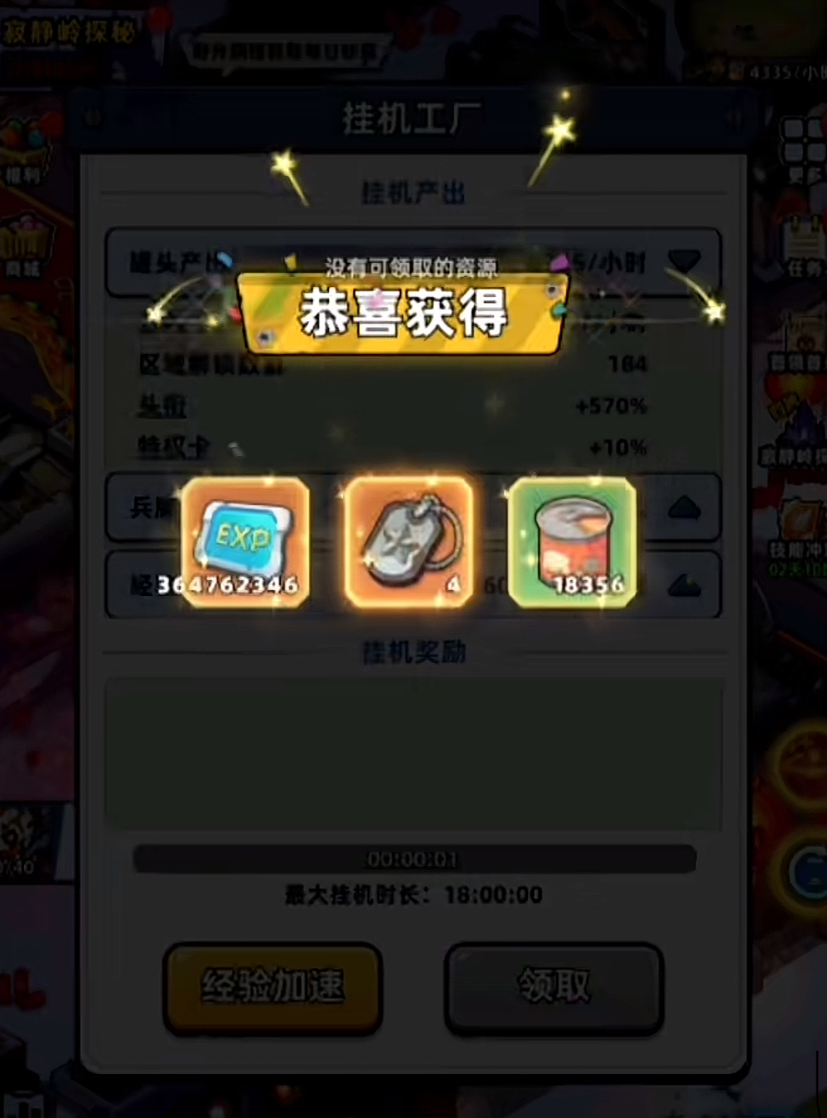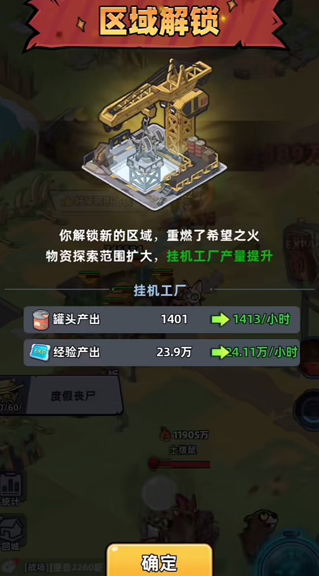 首先我们需要解锁工厂板块,解锁之后工厂就会自动开始运行,即便是大家在离线状态下,工厂也会稳定持续的产出基础资源,比如罐头和士兵的识别牌等。不过工厂产出的资源不会直接进入大家的背包中,如果长时间不领取,等到仓库的容量达到上限之后资源就会无法继续累积,所以大家要记得定时去主页的挂机工厂领取物资。