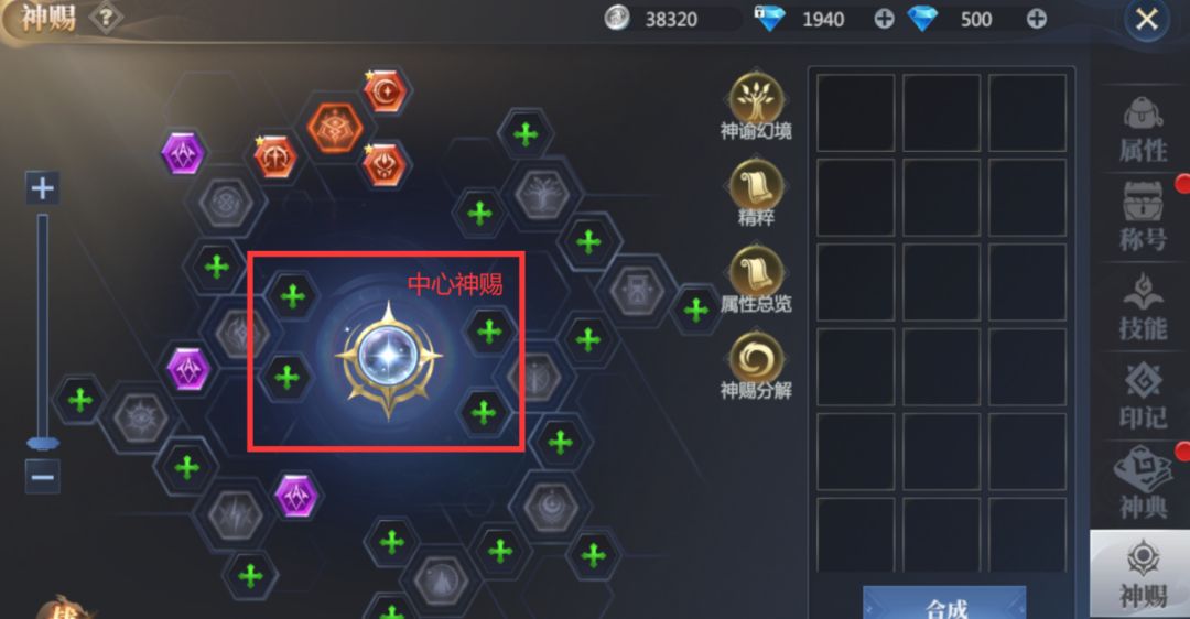 2、神赐装备∶神赐装备分为外圈神赐和中心神赐,每种神赐仅可装备在对应的神赐孔位上。