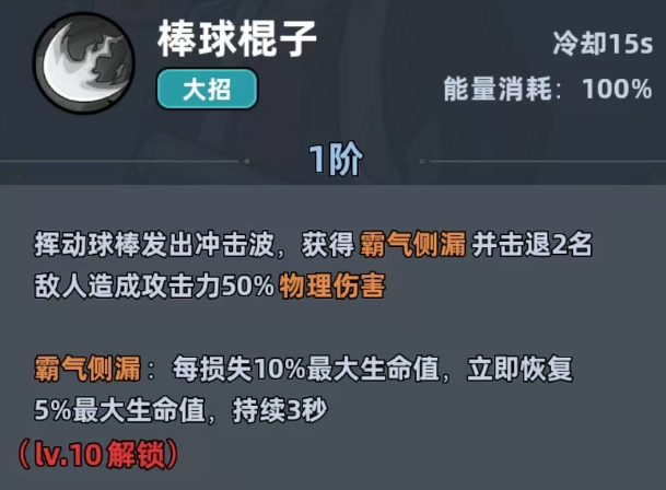 棒球棍子是他的大招,具有15秒冷却,还可以消耗百分百的能量。一节就能挥动球棒去释放冲击波,击退两名敌人之后,并且造成50%的物理性伤害,还可以解锁霸气侧漏的状态。每损失10%最大生命值,就可以恢复5%的最大生命值效果。在10级之后可以解锁二阶大招每击中一名敌人,那霸气侧漏的持续时间就可以额外的增加一秒。团队中击中敌人越多,续航也就越久,残血反打就会成为一种常态。