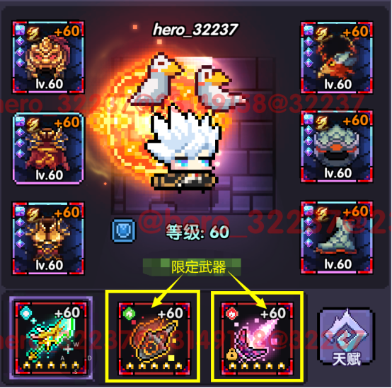 •限定武器装在背包中的第二、三格,根据不同的场景携带不同的限定武器。限定武器会给自身带来大量的属性加成。