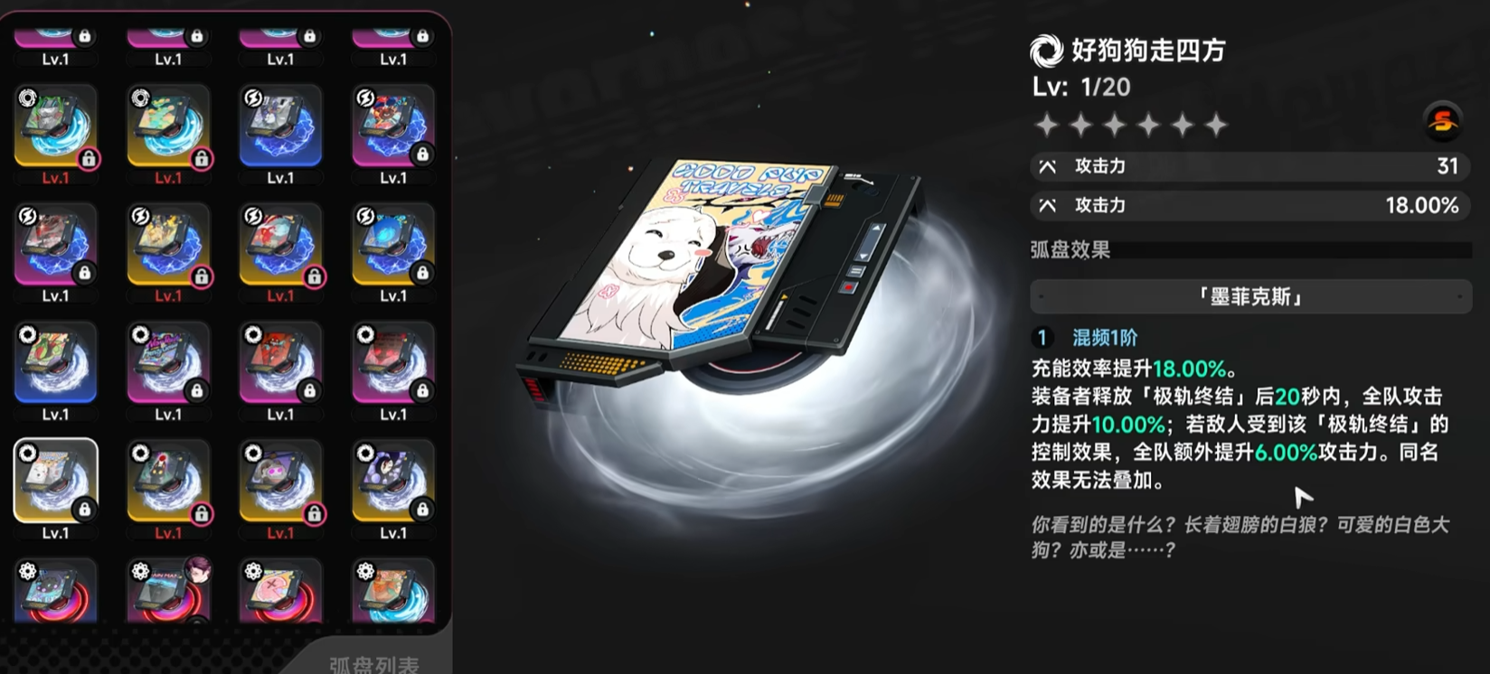 与之形成互补的是“好狗狗走四方”弧盘,该装备侧重团队协同作战效能。当角色施放“极轨终结”技能后,全队将在20秒内获得10%攻击力提升;更关键的是,此期间敌方所有攻击行为,均会额外受到全队攻击力数值的反向转化伤害。因此,它在大型团本及BOSS战中具备不可替代的战略价值。尤其适配具备强控能力的角色(如缄默、艾琳),通过稳定控制延长增益覆盖时长,从而最大化小队整体爆发阈值。