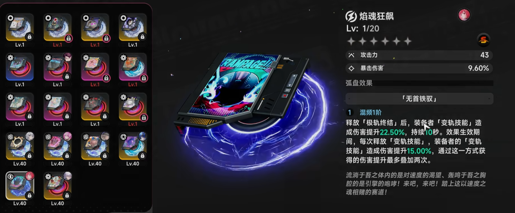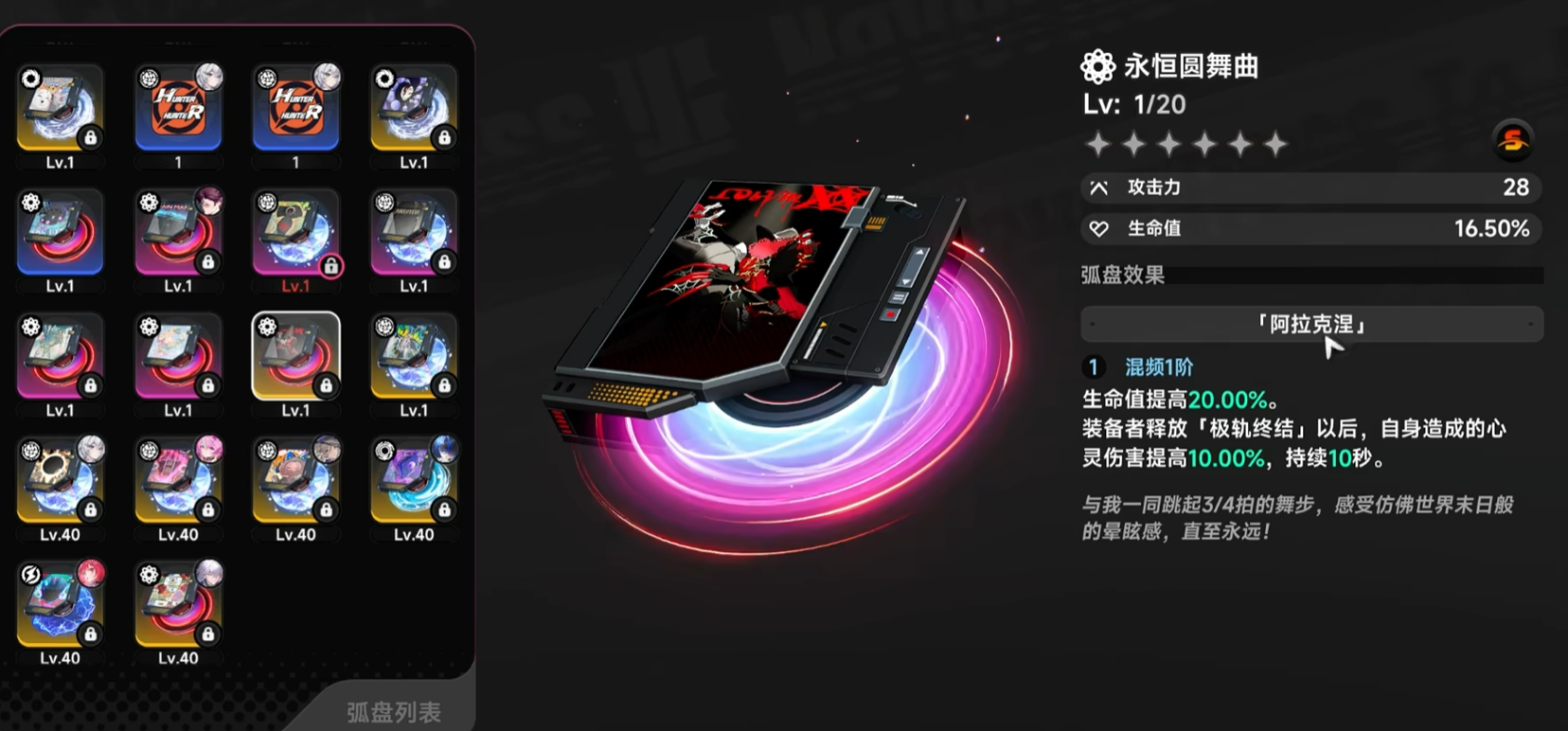 “永恒圆舞曲”弧盘聚焦生存与持续作战平衡性,其效果为:角色使用“极轨终结”时,自身“内心受伤”状态增加10%,但该状态在接下来10秒内强制无效。该特性极大缓解了高频率释放终结技带来的负面反馈,尤其适合武将类依赖终结技打连段、打节奏的职业,兼顾输出续航与容错空间。“焰魂狂飙”弧盘则是纯爆发导向的毕业级选择,装备者完成“极轨终结”后,“变轨技能”的释放频率由每秒3次提升至每秒4次;且每次释放均可提升25%伤害效果,总计提升达10%。