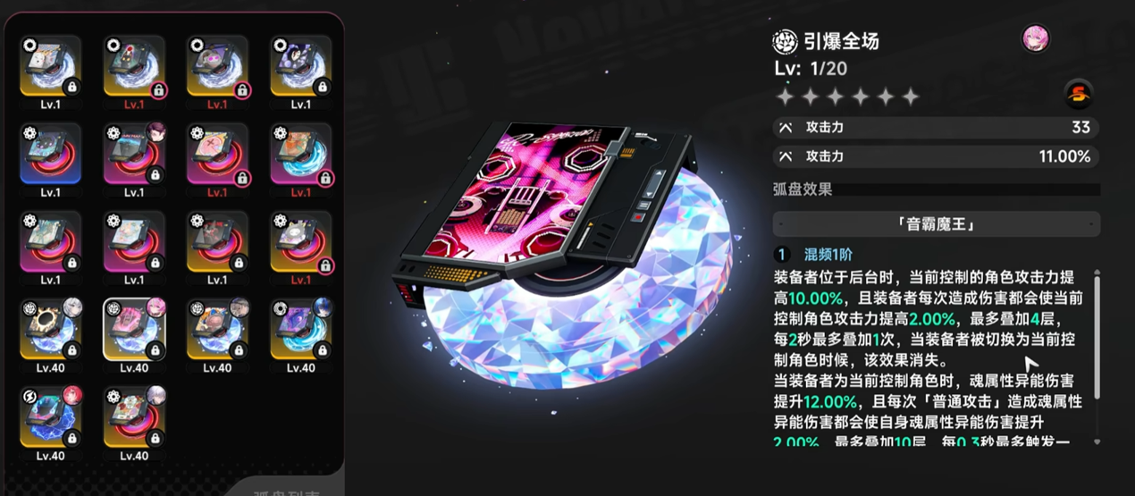 “引爆全场”弧盘则服务于多角色轮换体系,强调后台资源积累对前台输出的赋能。当装备者处于后台状态时,当前操作角色获得10%基础攻击力加成;每次后台角色造成伤害,都将为前台角色再叠加2%攻击力,最高可叠至4层。这一机制鼓励玩家主动切换角色、构建技能循环,并通过后台持续供能维持前台持续高压输出,特别契合能量管理型队伍配置,有效提升单位时间内的综合DPS稳定性。